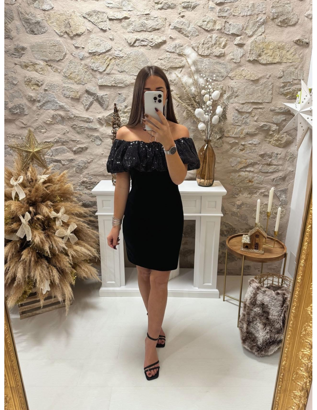 - Les sequins brillants ajoutent du glamour à la robe